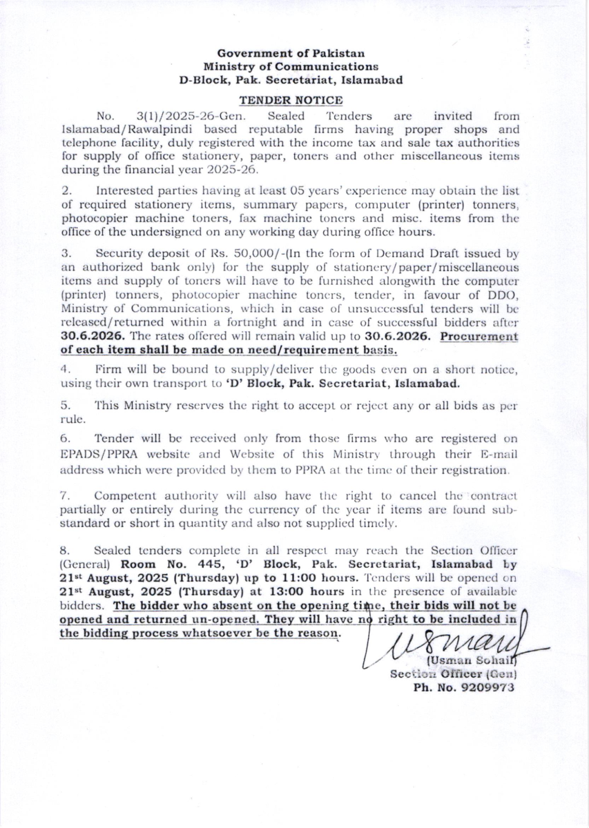 Tender Notice for supply of office stationery, paper, toners and other miscellaneous items during the financial year 2025-26.